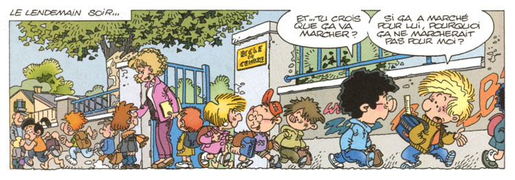 Nelly LAUDEC : Nous nous sommes rencontrés grâce à une amie commune. Ce fut le coup de foudre ! J’étais institutrice et, jusqu’à la fin de ma carrière, je lui ai soufflé des gags. Nombre de personnages de Cédric, tels Chen ou Caprice, sont inspirés de mes élèves. L’idée de base était de raconter les tribulations d’une institutrice. Puis le projet a évolué vers celles d’un petit garçon. Mademoiselle Nelly, l’institutrice de Cédric, c’est moi, bien sûr !