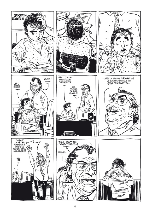 Y. L. : Mes personnages animaliers supposent une approche humoristique qui ne correspondait pas à l’incroyable polar que l’on raconte. Je me suis occupé du découpage en prenant soin de faire respirer le récit grâce à des scènes plus légères, décrivant le quotidien de Denis. Laurent Astier, que Dargaud nous a recommandé, a dessiné l’ensemble en fluidifiant ma mise en scène.