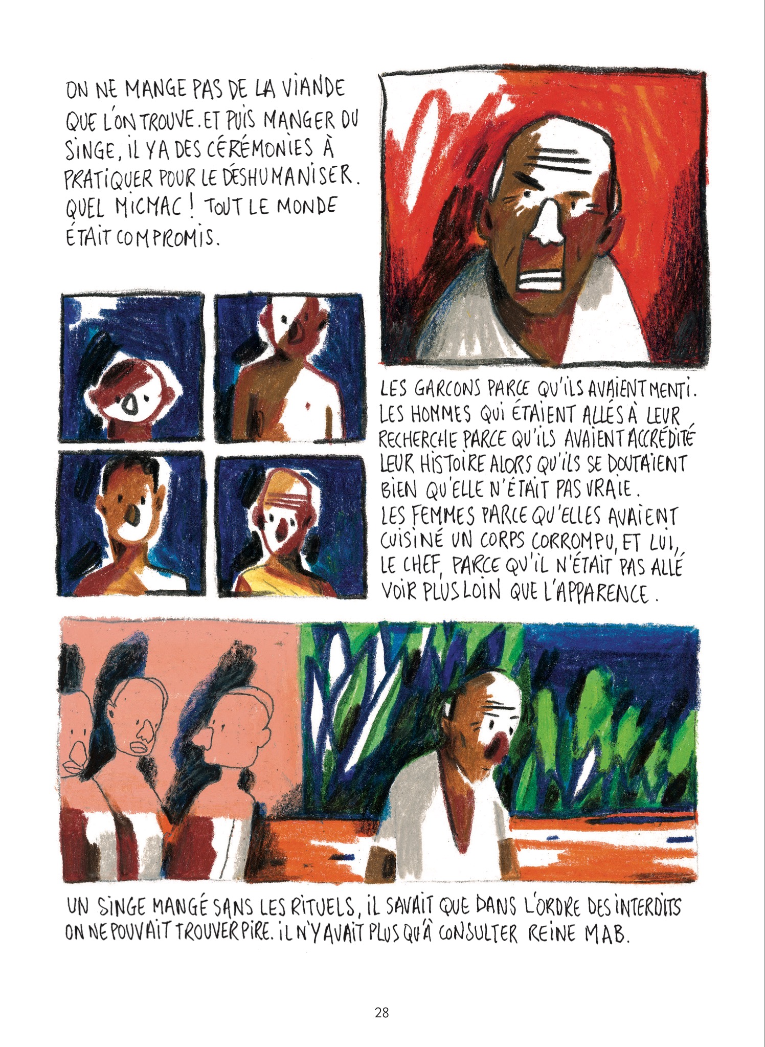 Adaptée du roman éponyme de Paule Constant, Des chauves-souris, des singes et des hommes est une bande dessinée poignante et troublante. Au premier abord, on pourrait s’attendre à découvrir un roman graphique plein de vie. En effet, le dessin coloré, naïf et brut de Barroux plante un décor africain plutôt accueillant, entre terres rouges et végétation luxuriante. Puis on entre dans l’histoire, et on assiste, impuissant, à la naissance et à la propagation d’une des plus virulentes épidémies de ces dernières années. Le récit est fort, les mots sont pesés, ciselés et chaque phrase contribue à installer cette ambiance suffocante. Ici pas de bulles, mais des blocs de texte qui viennent s’articuler avec des cases isolées, des cabochons, des illustrations en pleine page. La composition, le rythme et le rapport entre l’écrit et les images sont particulièrement soignés et percutants. Le lecteur est happé, plongé au coeur de cette tragédie. Une lecture marquante !