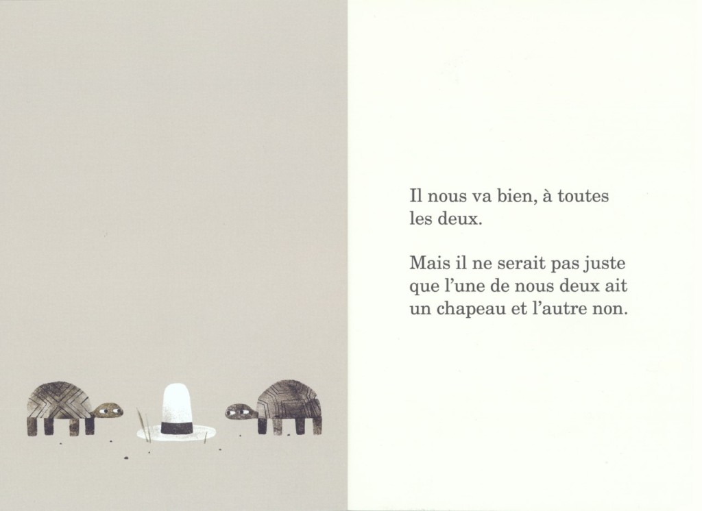 Deux tortues et un chapeau, forcément il y en a une de trop. Surtout que ce chapeau va aussi bien à l’une, qu’à l’autre, alors comment décider qui va le porter ? Pour ne pas faire de jaloux, il n’y a qu’à l’oublier ce chapeau. Mais tout de même, il est drôlement beau ce chapeau. Peut-être que le coucher de soleil fera oublier ce dilemme à nos deux amies, et que la nuit tombant, le sommeil arrivant, elles vont laisser vagabonder leurs pensées vers d’autres sujets ? Rien n’est moins sûr… car il est quand même beau ce chapeau.