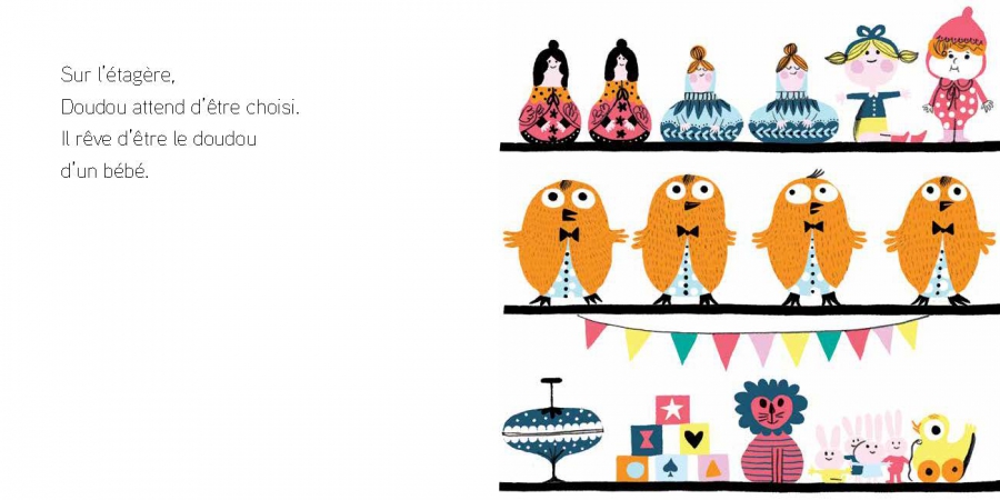 Que serait un doudou sans un bébé auprès de qui se blottir ? Dans ce petit album cartonné de Magali Le Huche, on partage les espoirs, les doutes et les angoisses d’un doudou en quête d’un bébé prêt à l’adopter. Tout commence sur les rayonnages du magasin de jouet. Il faut déjà passer la première étape, et attirer l’attention des parents venus acheter une peluche. Vient ensuite le moment des présentations, pas de blagues, il faut faire bonne impression. Bébé aura-t-il le coup de foudre pour cette petite boule de poils ? Dans son lit, la concurrence est rude, doudou n’est pas seul, il a bien vu autour de lui l’éléphant, le lapin ou le hochet ! Tous sont là pour les mêmes raisons. Sera-t-il le préféré ? La lumière s’éteint, bébé pleure, il faut sortir le grand jeu, c’est maintenant ou jamais, c’est le moment de tout tenter ! Allez doudou, courage, on est tous avec toi, tu vas l’avoir ton câlin, sois-en certain !