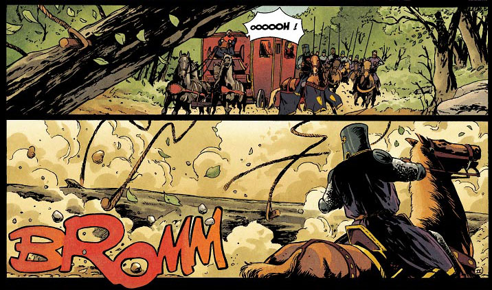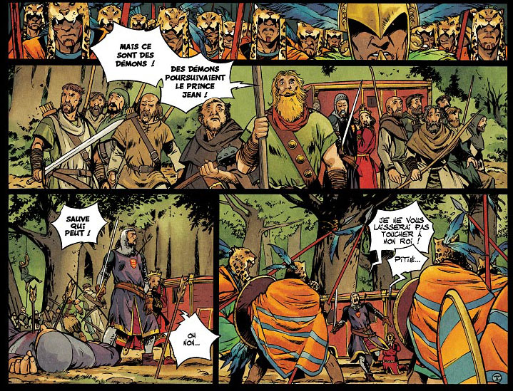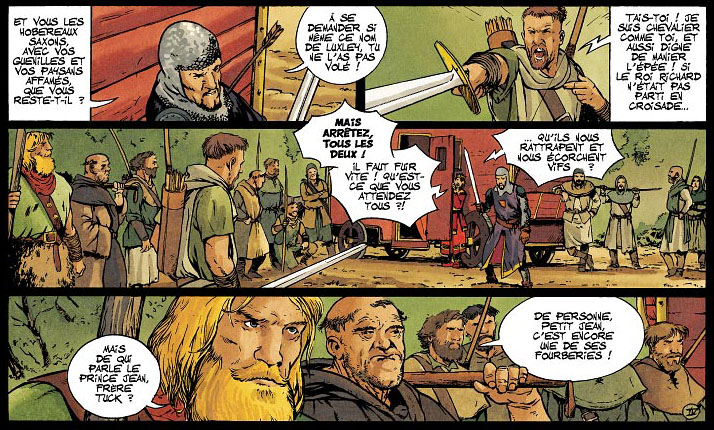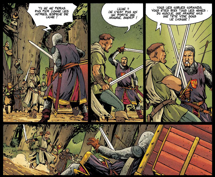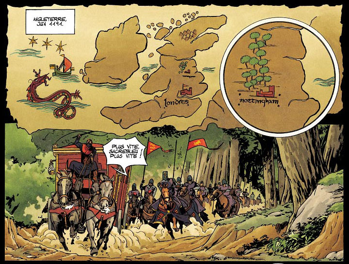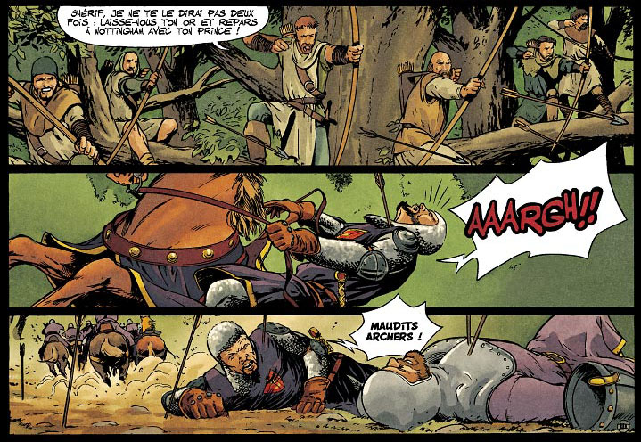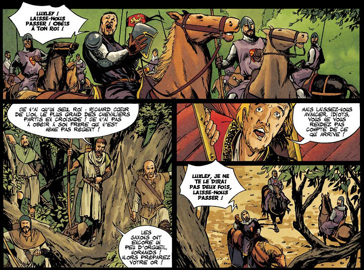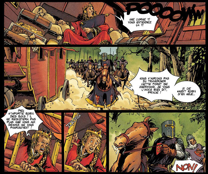 « Tous les deux avaient beaucoup aimé l’album mais regrettaient de ne pas voir au moins une fois Robin des Bois dans son rôle de justicier traditionnel. Nous avons décidé de leur faire plaisir ainsi, je l’espère, qu’à beaucoup d’autres lecteurs : nous avons réalisé une nouvelle séquence BD avec le méchant prince Jean aux prises avec les joyeux compagnons de Luxley dans la forêt de Sherwood. Mais, bien sûr, la scène ne se termine pas exactement comme dans un film avec Errol Flynn ou Kevin Costner ! »