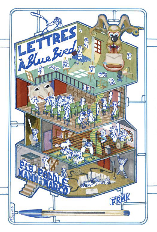 Au fil des bribes qui nous sont données, que nous raconte Lettres à Blue Bird ? Une personne qui se dévoile, et qui ne va pas très bien, vaguement hippie ou chanteuse punk, rêvant un lieu de vie alternatif au Glaglaland – pays de ses rêves où elle va vivre avec Blue Bird et accomplir ce rêve. Un rêve qui vire au cauchemar sur fond de croisement entre les mondes, d’images envahissantes qui se répètent (l’étonnant Dingo sous acide de la couverture, un nain de jardin flippant…) et de ce qui semble être une crise de parano… ou bien a-t-elle raison et des amis ont voulu sa mort ? Une petite chanson du nouveau pote bibliothécaire se rêvant bon roi d’une colonie d’enfants naufragés (« un Jules Ferry en mieux »), au milieu de tout ça, ajoute au charme.
