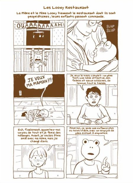 Le sujet peut sembler banal et soporifique comme un film danois. Il n’en est rien. Par petites touches, sensibles et évocatrices, le jeune Dash Shaw (25 ans seulement) parvient à dresser un portrait affectueux de chacun des membres de cette famille décomposée. Les gestes ont autant d’importance que les mots, les silences valent les regards. L’auteur s’applique ainsi à ponctuer ses dessins relativement simples de petits mots définissant les bruits ou les mouvements (et attention, pas par de simples onomatopées, mais par des verbes comme « coulisse », « froisse »…). Il s’attarde aussi sur les détails graphiques de l’environnement de ses protagonistes, comme les nervures du bois, la mer qui laisse sa trace sur le sable en se retirant, ou l’eau s’échappant par la bonde de l’évier.