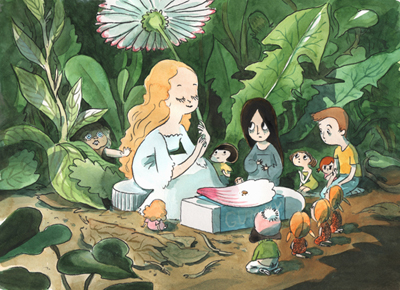 Gamine, j’adorais être à quatre pattes dans l’herbe et regarder les insectes. J’ai grandi à Kerascoët, en Bretagne, où je n’avais pas la télé. Pour cet album, je me suis replongée dans mes lectures d’enfance : Beatrix Potter, Tom Pouce, La Petite Poucette, Gulliver, Nils Holgersson, les livres de l’illustratrice américaine Gyo Fujikawa… »