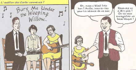 Les Américains David Lasky et Frank M. Young abordent cette biographie familiale par le biais de Alvin Pleasant Carter, doux rêveur à l’origine du groupe, qu’il fonda avec sa femme et la cousine de celle-ci. Rien ne tape à l’œil dans cet album : le trait est direct, sans chichis, les cases déroulent sagement la vie et l’intimité des Carter, laissant l’émotion s’installer. Les couleurs un peu passées renforcent l’effet nostalgique sans outrance. Des années de recherche et de documentation signent la volonté d’authenticité des auteurs.