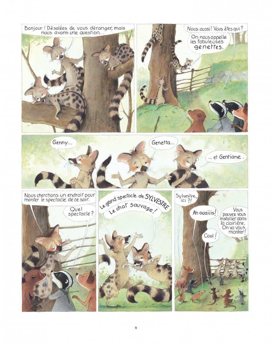 C’est l’effervescence dans la forêt, Sylvestre le Chat sauvage, le célèbre acrobate, va se produire en spectacle dans la clairière. Les enfants de Monsieur Blaireau et Madame Renarde sont tout excités à l’idée d’approcher leur idole. Mais pour Roussette, la rencontre avec son artiste préféré ne va pas se passer comme elle aurait pu l’imaginer. Arrogant et moqueur, le félin va tourner en ridicule la petite renarde. Humiliée et attristée, Roussette va tout remettre en question, son mode de vie, sa personnalité et son identité ! Elle va même fuir son foyer, peut-être pour mieux se retrouver ? Brigitte Luciani et d’Ève Tharlet livrent ici le sixième album de cette série jeunesse qui, au fil des sorties, à su conserver les ingrédients qui en font une vraie petite bulle de douceur particulièrement adaptée aux plus jeunes lecteurs. Pleine de bons sentiments, elle aborde de manière détournée et avec la distance qu’il faut, des sujets importants qui concernent le quotidien des enfants. Ces derniers pourront facilement s’identifier et se projeter dans ces aventures, pour se divertir et aussi un peu grandir. Pour les plus petits, l’entrée dans cet univers peut se faire grâce au spin-off Cassis, qui est un excellent marche-pied pour entrer dans le monde de la lecture.